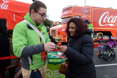 Volunteers are engaging members of the public about recycling while they queue for free samples of Coca-Cola products at the Christmas truck tour stops.