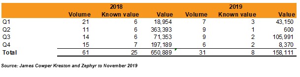 The level of activity we have experienced in 2019 does not show a significant reduction suggesting the market has moved to smaller consolidation deals for now, which will be picked up only as key players file their annual accounts. The long run average for the sector has been around 40 announced deals per year, so we would expect this to bounce back in 2020 and further deals to come to light that took place in 2019.