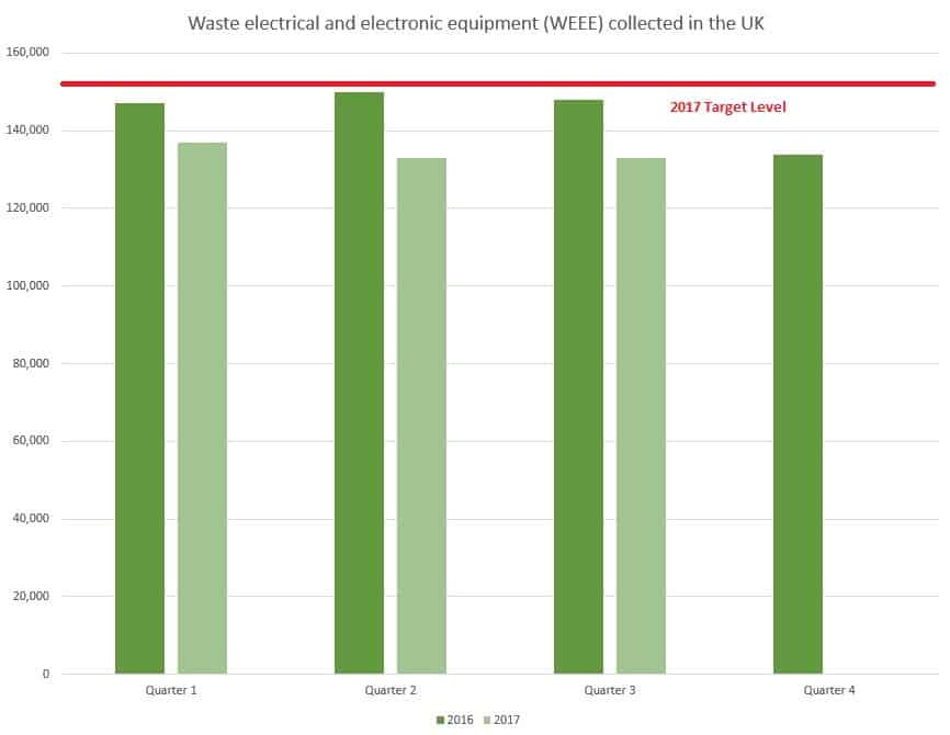 Provisional data, which was published on the Environment Agency’s website earlier this month, suggests that a total of 133,000 tonnes of household WEEE (waste electrical and electronic equipment) was collected for recycling in the months July to September 2017 from sources including local authority civic amenity sites.