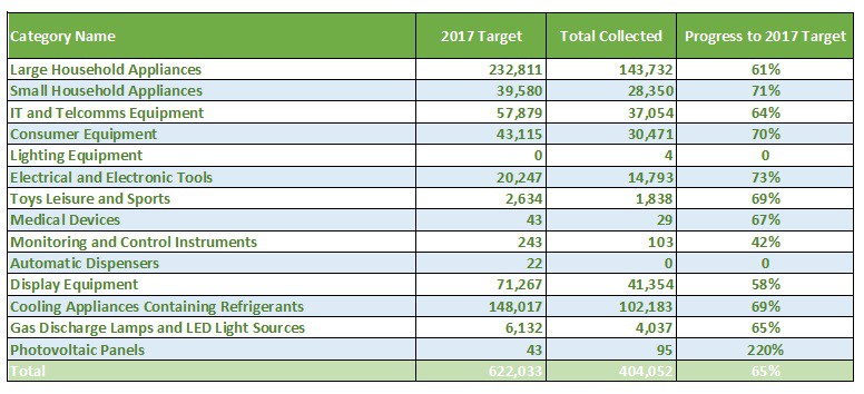 Collection targets set for 2017 by Defra fixed a goal to collect 622,033 tonnes of WEEE – based on trends in the tonnages of WEEE collected over the last three years. This was an increase of around 14.3% compared to the 2016 target – requiring schemes to collect around 40,000 tonnes more material than the previous year.