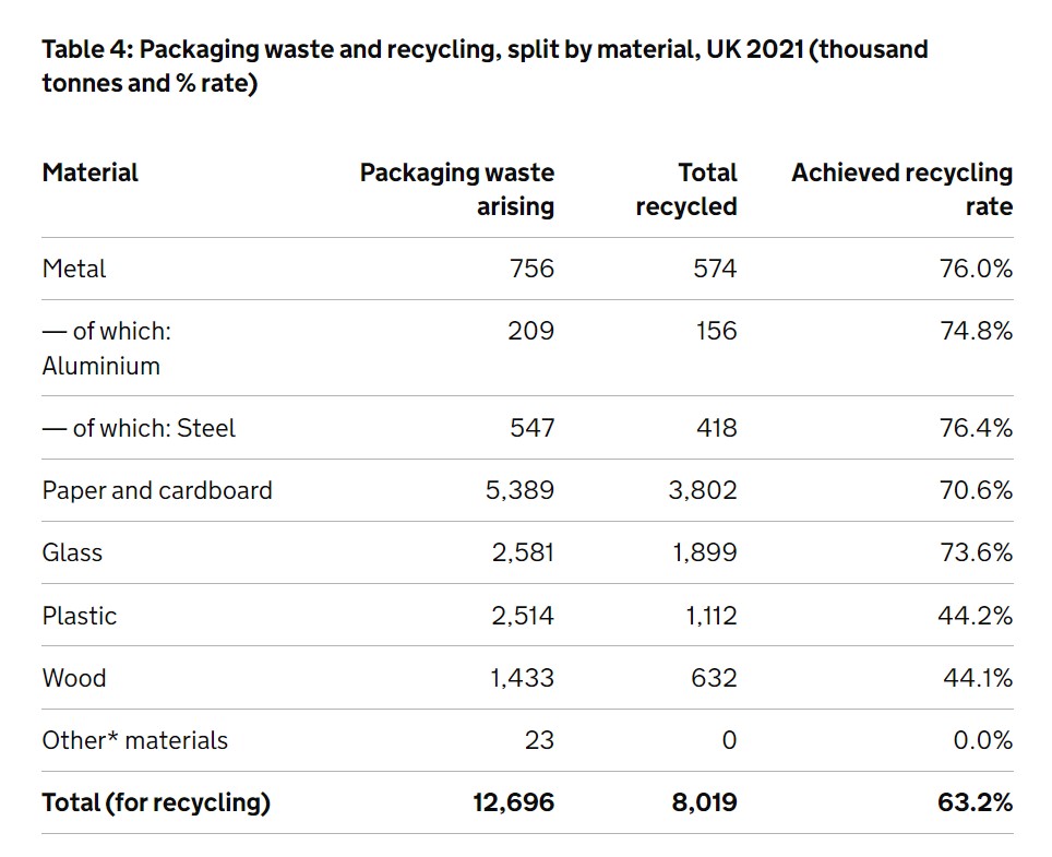 Figures for 2021 show that 63.2% of UK packaging waste was recycled in 2021, 0.1 percentage points up from 2020.