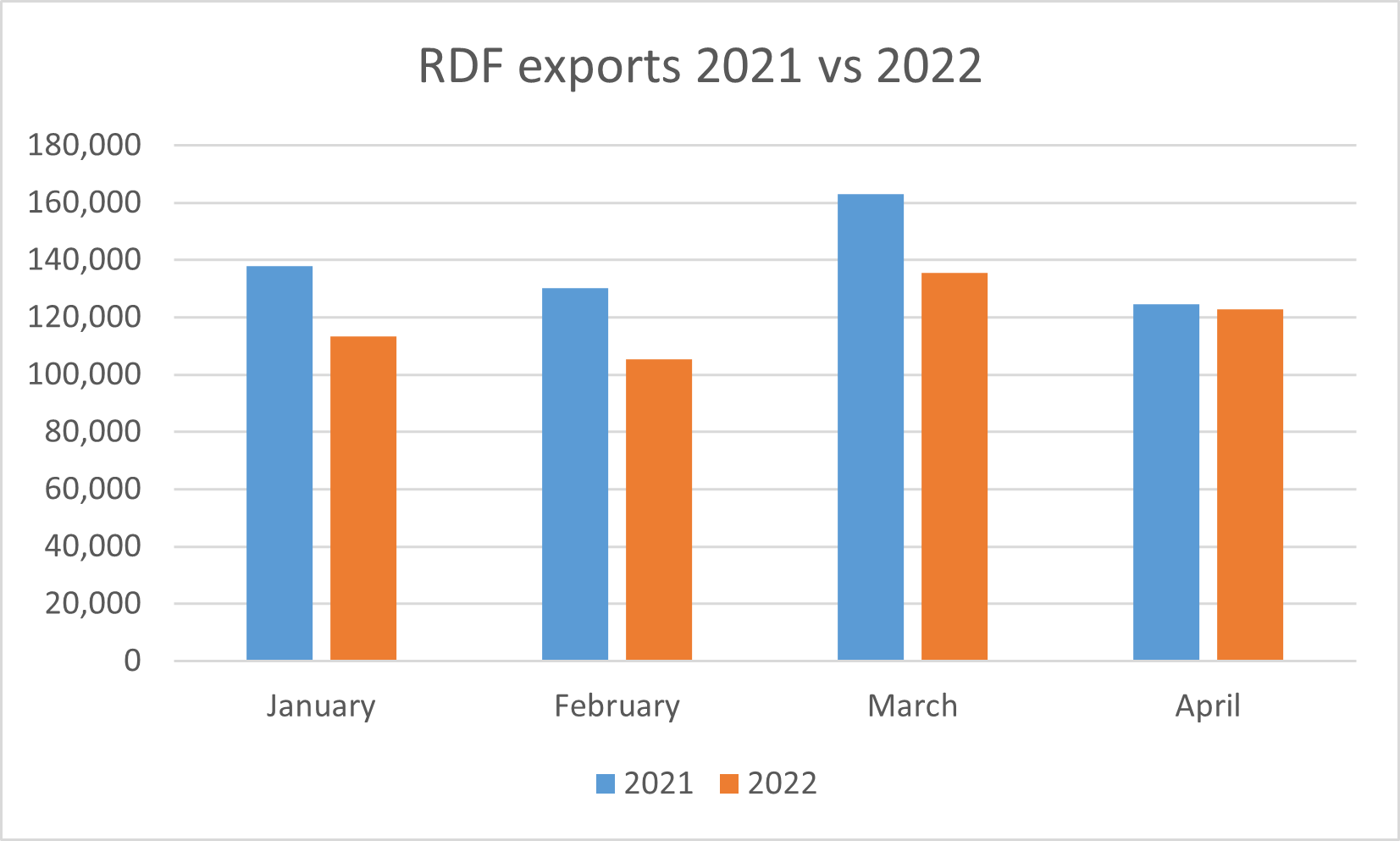 The numbers continue the trend of a steady decline of exports from England. In 2021, RDF exports fell by 8% from the previous year.