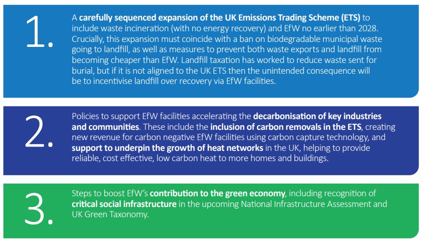 1. Bring EfW into the UK emissions trading scheme no earlier than 2028. Crucially, to deliver on the government’s objectives, this expansion should: