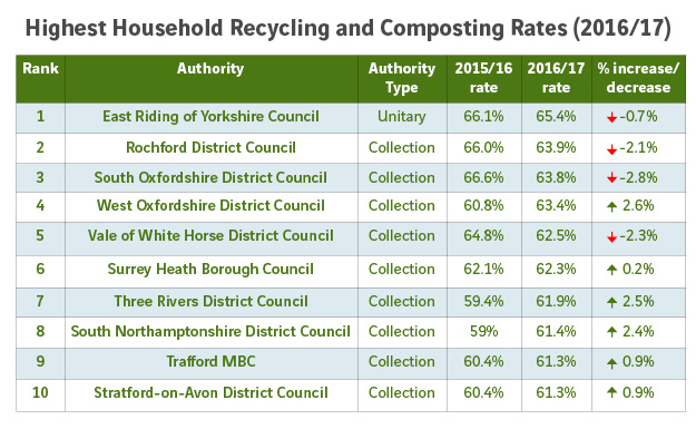 The top performing authority last year (2015/16) was South Oxfordshire district council and the authority (collection, not unitary) has come in third in 2016/17 with a rate of 63.8%. When it was top, the authority – which has Biffa as its contractor – reported a rate of 66.6%. Tighter controls of MRF output figures are thought to be one factor in the reduction to 63.8%.