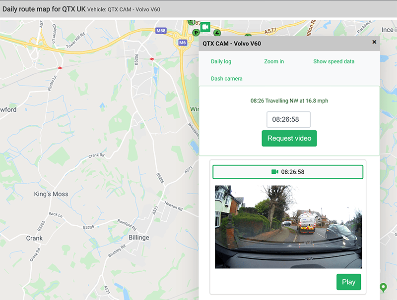Quartix users can request footage for specific data points on the map to help investigate incidents of erratic driving.