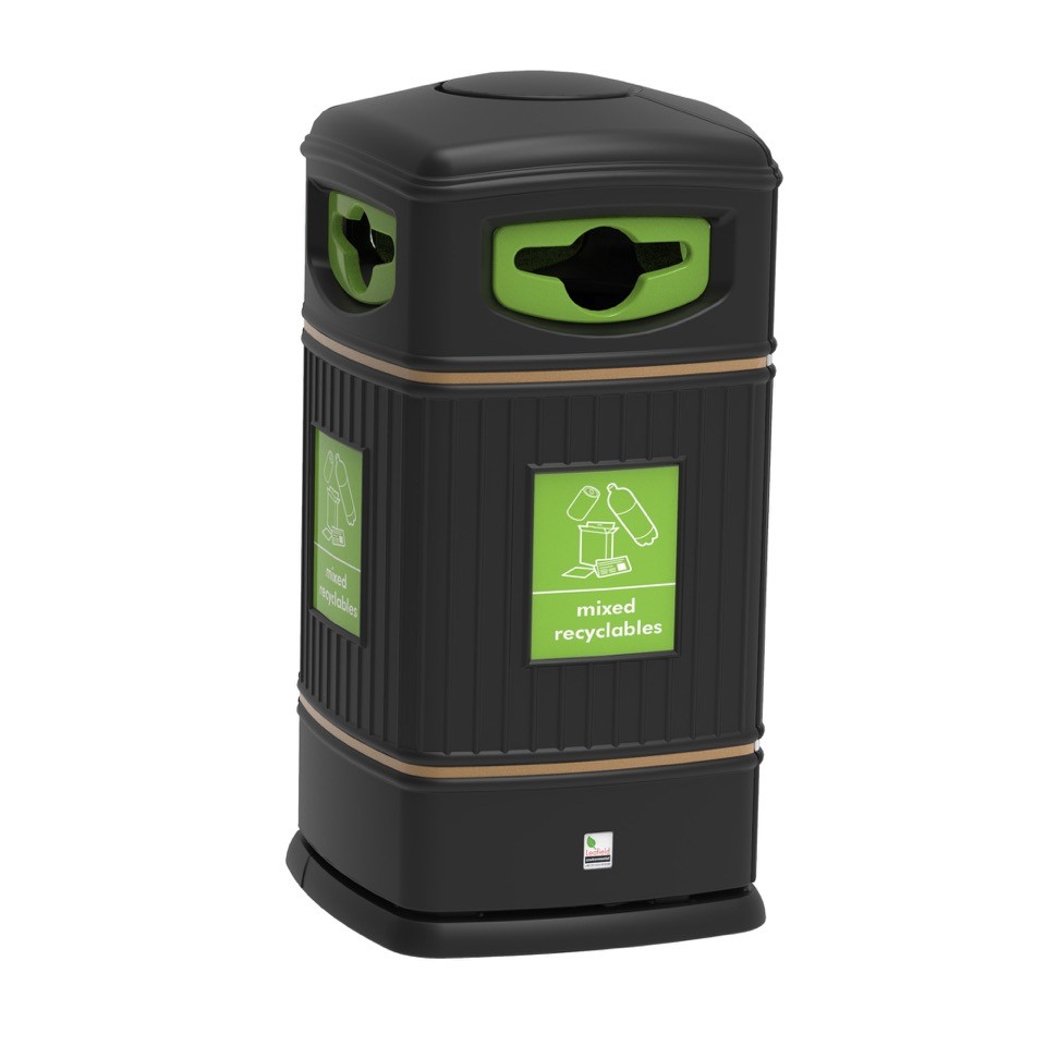 The company says the Square Heritage Recycling range’s WRAP compliant colour coded inserts with ‘propeller’ apertures and explicit colour coded graphics means each bin can be adapted for the collection of specific recyclate streams.