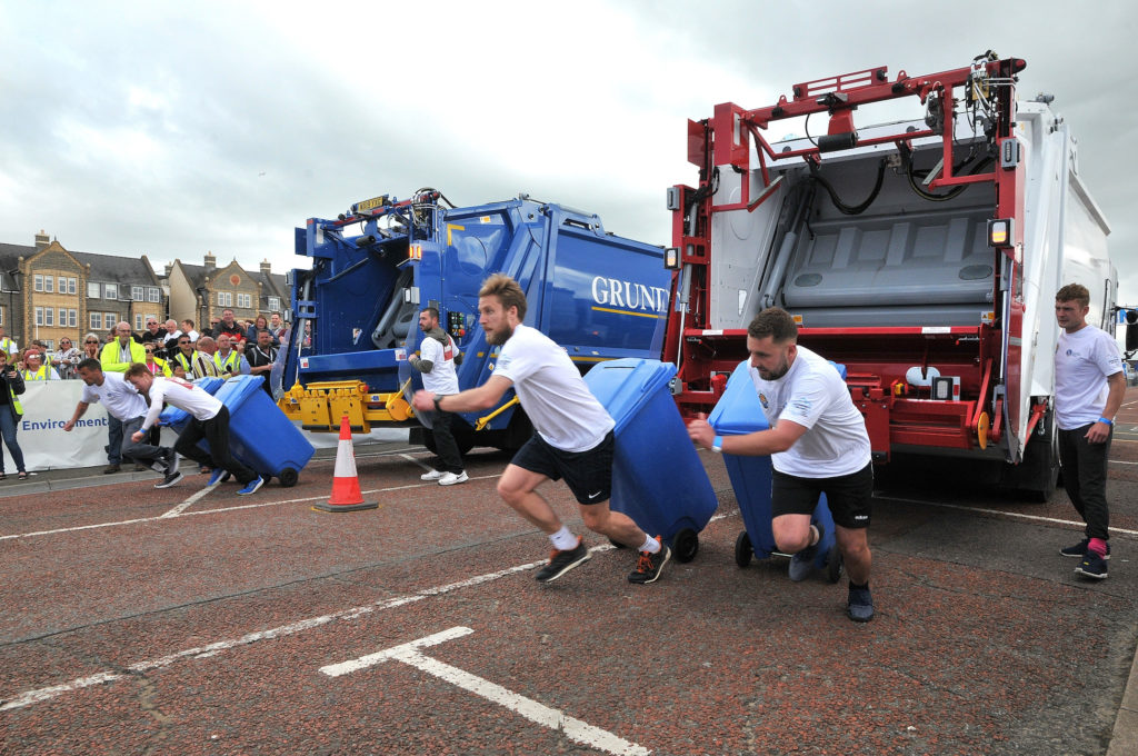 The event sees collection crews compete by loading wheeled-bins with bags of sand then pulling or pushing them to an awaiting refuse truck. Containers are emptied before the vehicles race to the finish line to find a winner.
