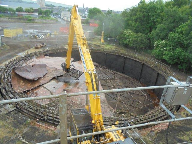 Recent work by KDC has included the demolition (pictured above) of two gas holders at Johnstone, Scotland for SGN. The first gasholder was of below ground, spiral guided construction with four lifts of riveted steel and a brick and puddled clay tank and had stood for over 82 years.