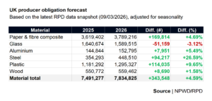 Obligations look higher for all materials except glass. The reduction in glass is likely due to the unintentional consequence of Extended Producer Responsibility (EPR): moving into lighter – though not necessarily more sustainable – materials to reduce waste management costs.