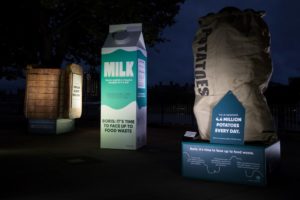 Three sculptures of the UK’s “most wasted” food items – potatoes, milk and bread – have been erected in London’s South Bank.