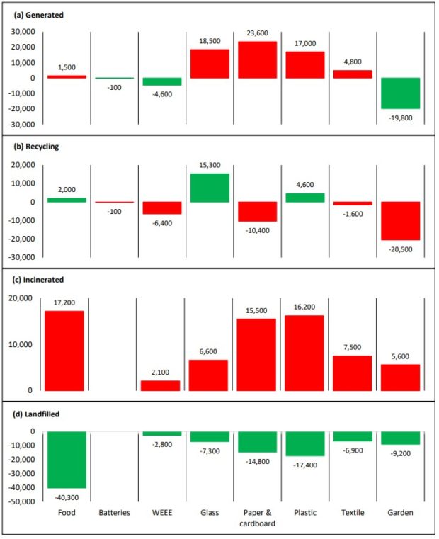 While most material streams saw a rise in tonnage generated, streams such as glass and plastic recorded a rise in tonnage recycled, softening the carbon impact of these steams.